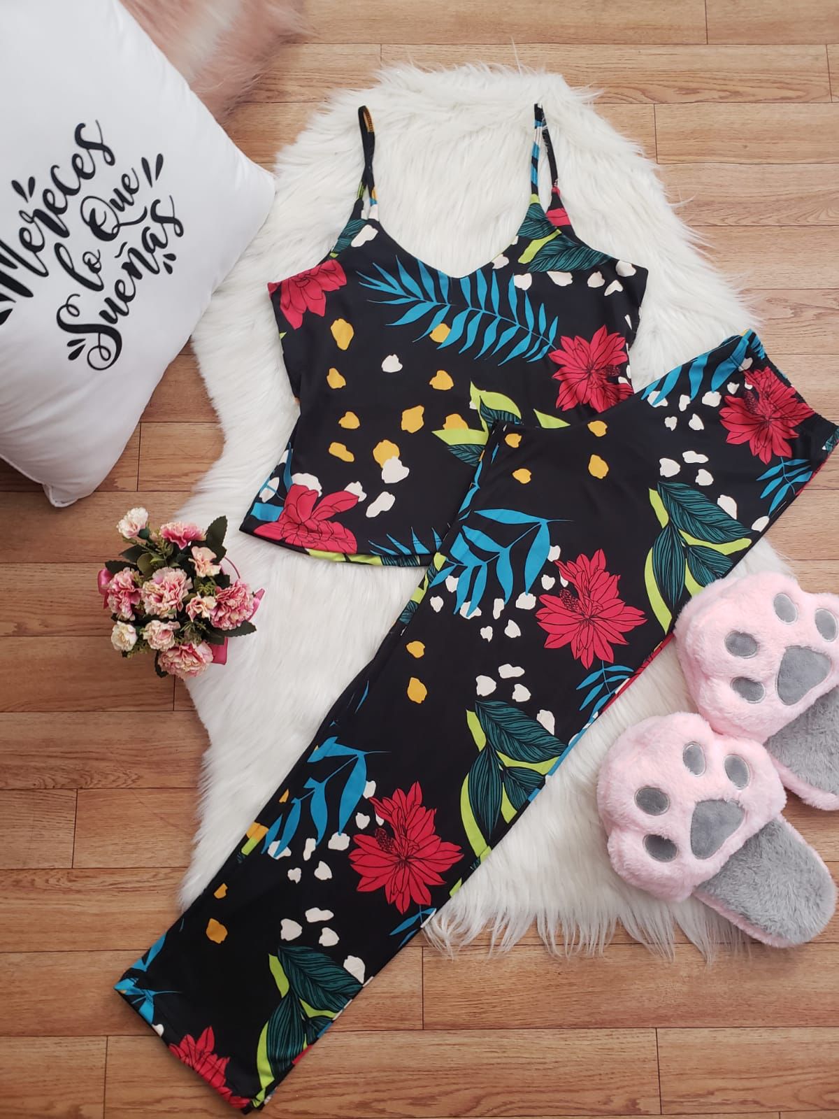 Pijama Dakota Conjunto Flor Colores Fondo Negro